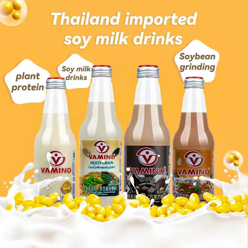 Vamino is a brand of soy milk drink, popular in Thailand and Southeast Asia, made from high-quality soybeans and other ingredients like sugar, palm oil, and milk powder. The drink comes in various flavors, including original, chocolate, and multigrain, and is sold in convenient 300ml glass bottles or cartons. Vamino is marketed as a plant-based, dairy-free alternative to milk and is a good source of plant-based protein.